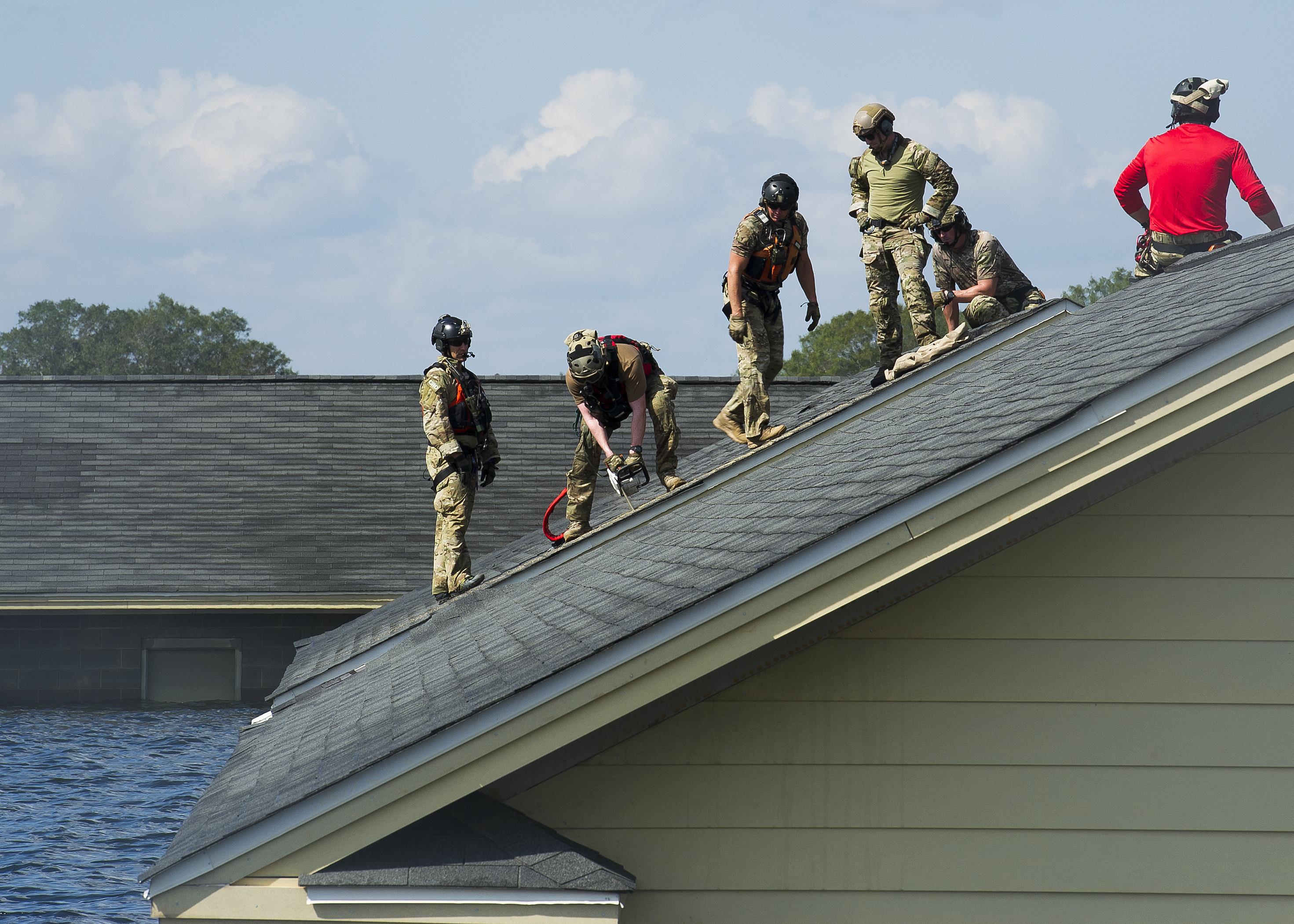 U.S. Air Force Reserve pararescuemen from the 308th Rescue Squadron perform extraction training utilizing a chainsaw to cut through the roof of a house in the residential flooding area of the Guardian Centers, Perry, Georgia, Oct. 11, 2017. Members from the U.S. Air Force's 308th, 301st and 38th Rescue Squadrons and U.S. Army's 20th Special Forces Group, spent Oct. 11-15 at the Guardian Centers, a metroplex providing 80 structures, 16 blocks and 75 acres of realistic urban training, to hone their search and rescue skills. (U.S. Air Force photo by Master Sgt. Stephen D. Schester)