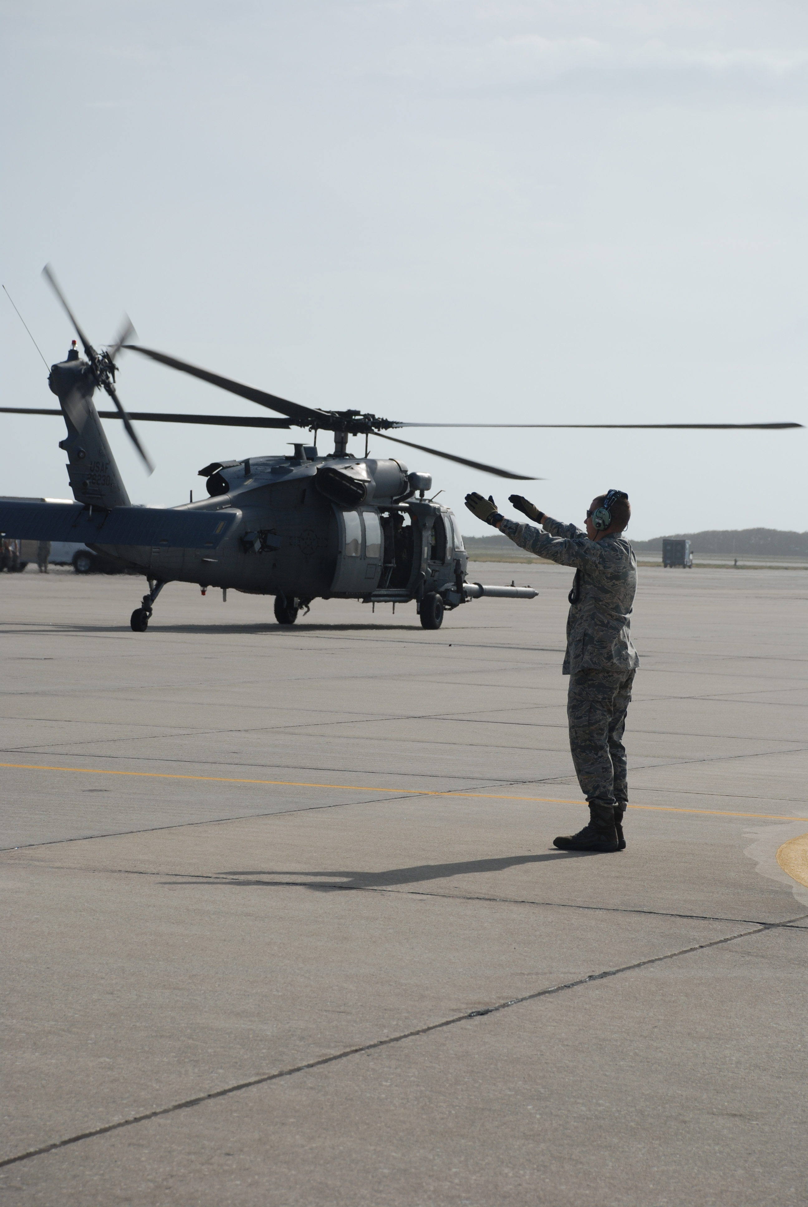 PATRICK AIR FORCE BASE, Fla. - A maintenance crew chief from the 920th Rescue Wing here directs this HH-60G Pave Hawk crew for flight prior to take off March 6, along with the wing's entire fleet of six pave hawks and three HC-130 King refueling aircraft to prepare for hurricane evacuations and deployments. (U.S. Air Force photo/Capt. Ryan Liss)