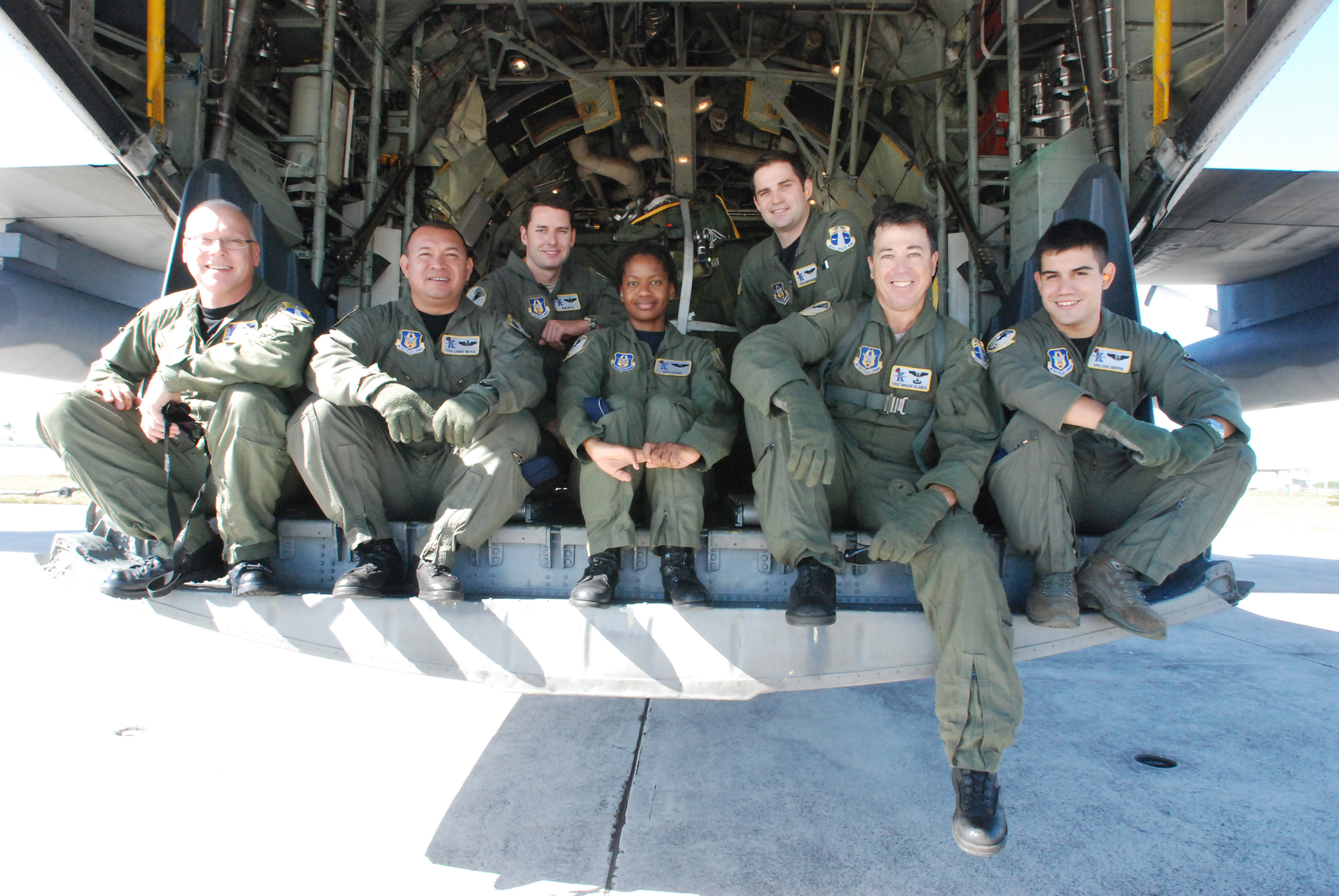 KEY WEST. Fla. - The pilots and flight crew (l-r) Senior Master Sgt. Kevin Zimmerman,Tech. Sgt. Leonardo Mossi, Maj. Robert Seitz, Capt. Anita Young, 1st Lt. Peter Schroeder, Tech. Sgt. Bruce Slamin and Senior Airman Daniel Ibarra, all Air Force Reservists from the 920th Rescue Wing, Patrick Air Force Base, Fla., get ready to compete in the Search and Rescue Exercise here against the Canadian rescue forces. (U.S. Air Force photo/ Staff Sgt. Leslie Kraushaar)