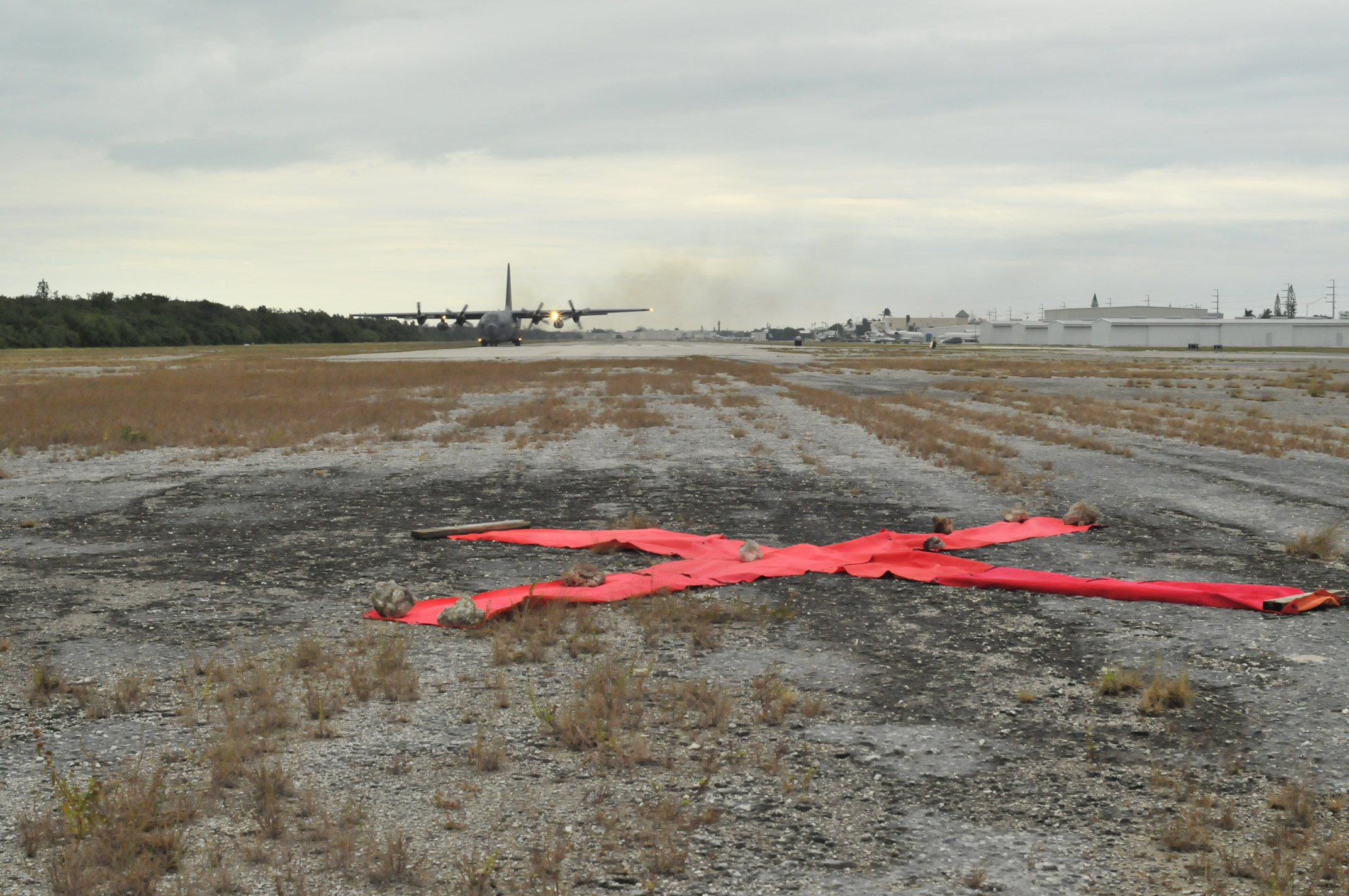 MARATHON KEY AIRPORT, Fla. - Airmen from the 920th Rescue Wing, Patrick Air Force Base, Fla. pilot three HC-130P/N Kings to the Florida Keys to participate in a joint search and rescue exercise with Canadians Dec. 8-13, 2010. Here the Airmen are evaluated on their spot landings and equipment drop accuracy. (U.S. Air Force photo/Capt. Cathleen Snow)