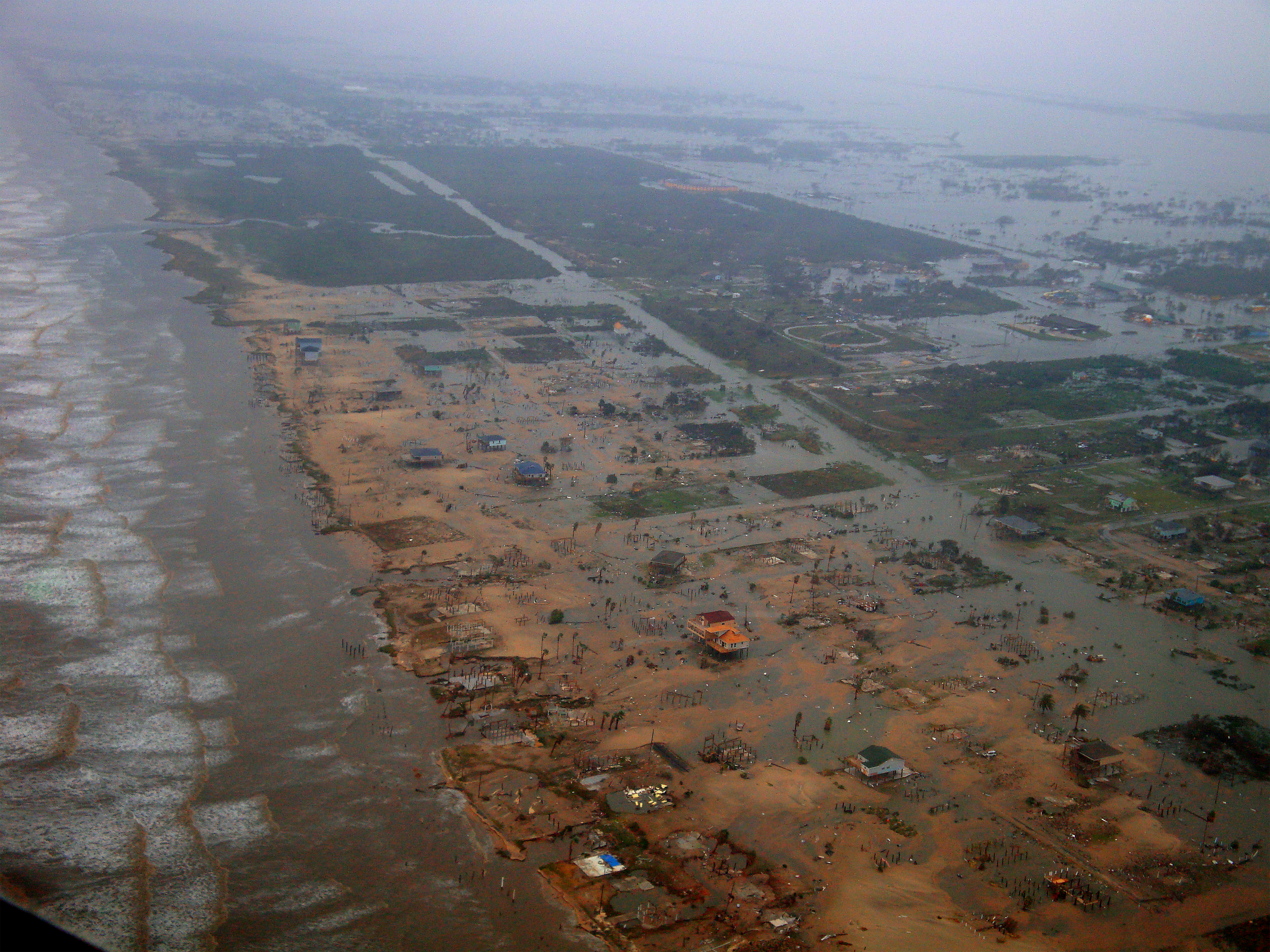 GALVESTON, Texas -- The Galveston coastline lies in ruin roughly 14 hours after Hurricane Ike made landfall, with only a few, lucky houses still standing. Deployed to the Gulf region days before the deadly hurricane struck, 920th Rescue Wing reservists took part in the relief effort and saved 17 lives in the small Texas town of Nederland. (U.S. Air Force photo/Capt. Steve Sartain)