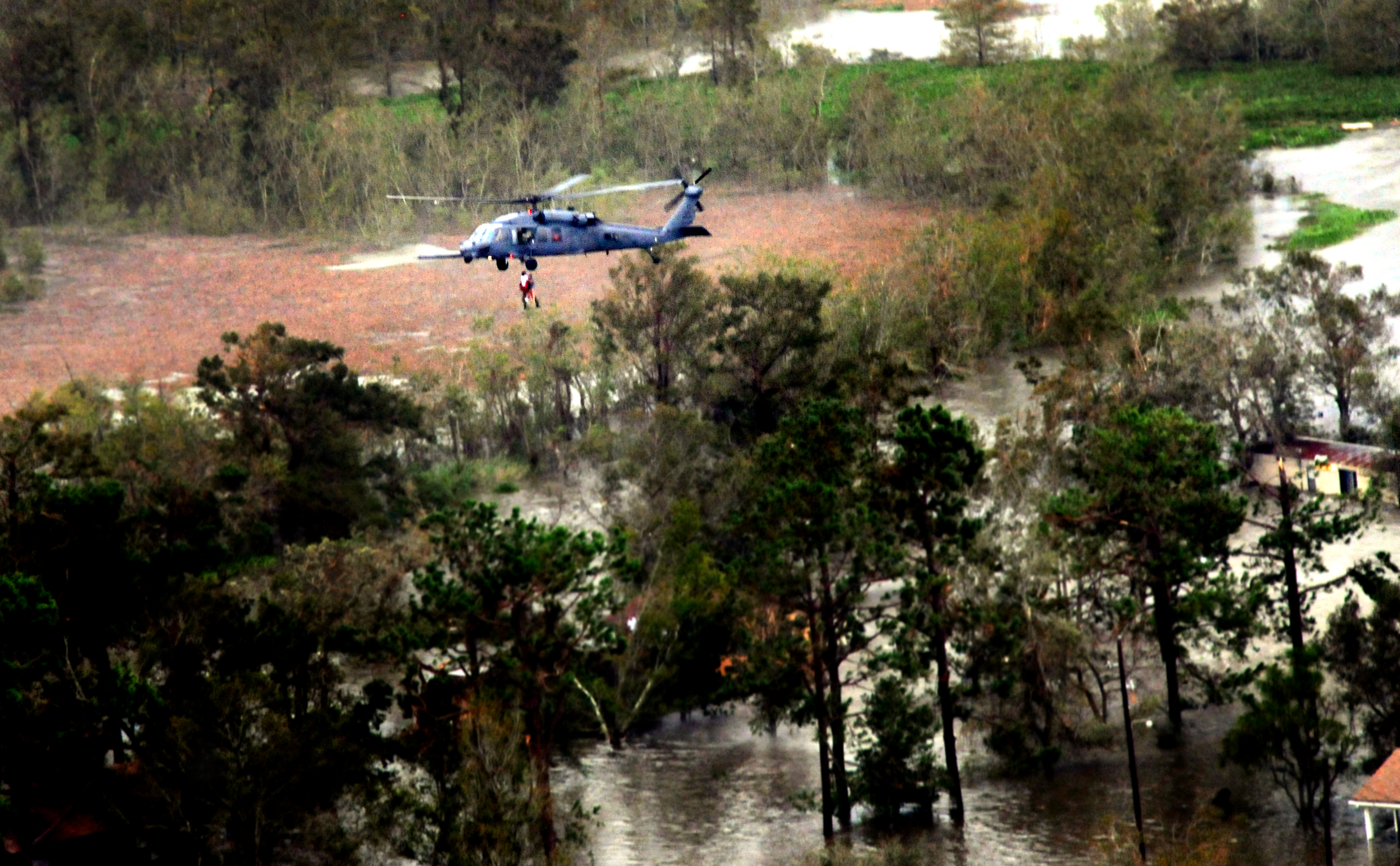 NEDERLAND, Texas -- A person stranded by the floodwaters of Hurricane Ike is hoisted up to an Air Force Reserve HH-60G Pave Hawk along with the pararescueman (PJ) performing the rescue at a small Texas town Sept. 13. Both the PJ and the Pave Hawk belonged to the 331st Air Expeditionary Group, The organization in charge of air support due rescue operations in the wake of the lethal hurricane, which claimed more than 30 American lives in the Gulf region. The rescue was the first made by two aircrews aboard two HH-60G Pave Hawk helicopters who were en route to the Galveston, Texas area when they spotted the tiny town of Nederland -- population 2,000 -- almost completely covered by floodwaters. They immediately broke from their route and began scanning the city for anyone hurt or suffering due to the deadly storm. Just minutes after they arrived, the crews were pulling people from rooftops and off of flooded roads. In all, the two helicopter crews, deployed for hurricane relief from their home at the 920th Rescue Wing, Patrick AFB, Fla., saved 17 people from Nederland. (U.S. Air Force photo/Tech. Sgt. Paul Flipse)